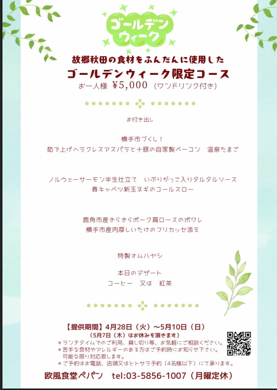 いつもよりちょっと贅沢に、旬の味わい、故郷秋田の食材を活かしたゴールデンウイーク限定のお得な1ドリンク付きコースをご用意致しました🌸🌳ぜひこの機会にご利用下さい!