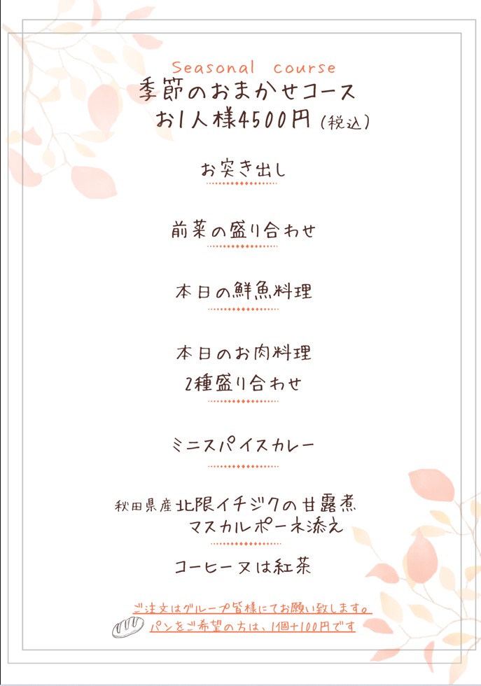 *5名様以上のご来店(ご予約無し)は、内容おまかせコース料理のご提供とさせて頂きます。
